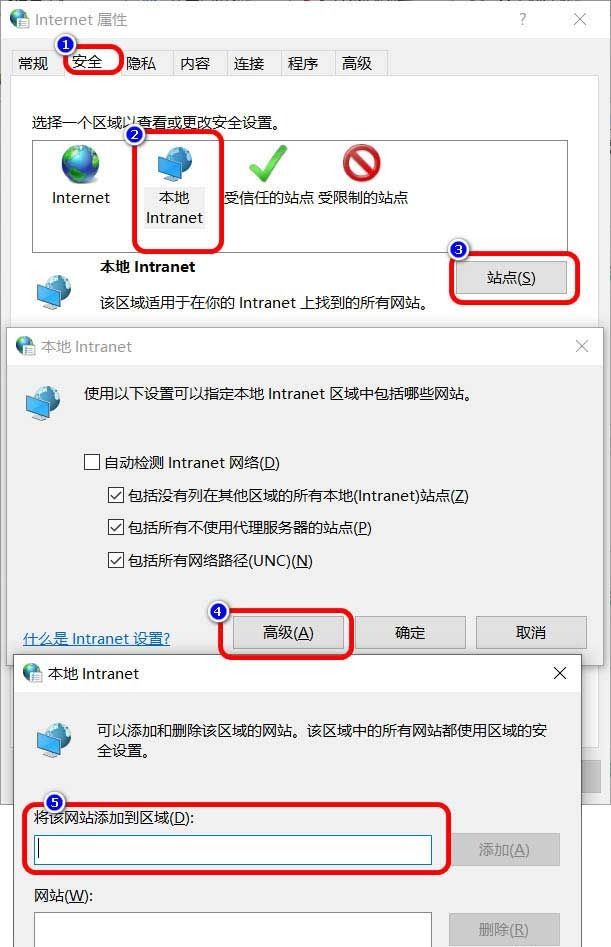 2、寻找“安全”选项卡,点一下“当地Internet”,再点一下“网站”按钮,随后点一下高級。输入另一方的IP(这儿就是我的路由器的IP),点“添加”就可以了。(可以用*号,如:192.168.31.*,就意味着全部段了)。最终一直点确定就可以。