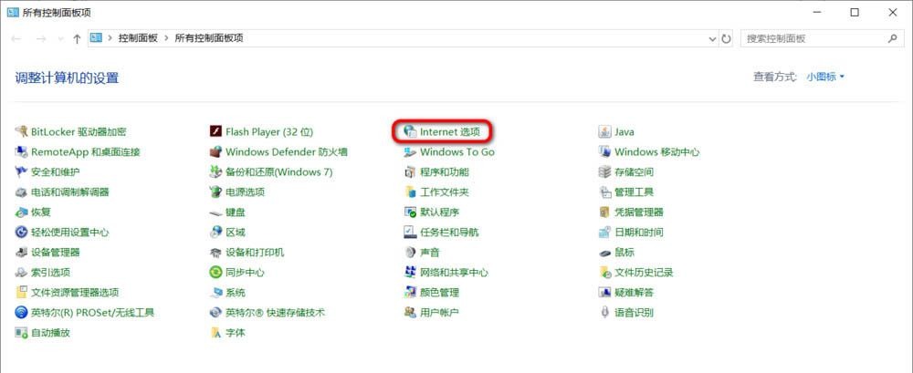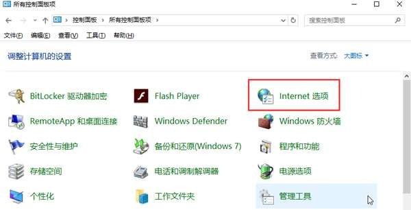 2、调出控制面板窗口后,以大图标查看方式寻找internet选项并将其开启,如下图所示: