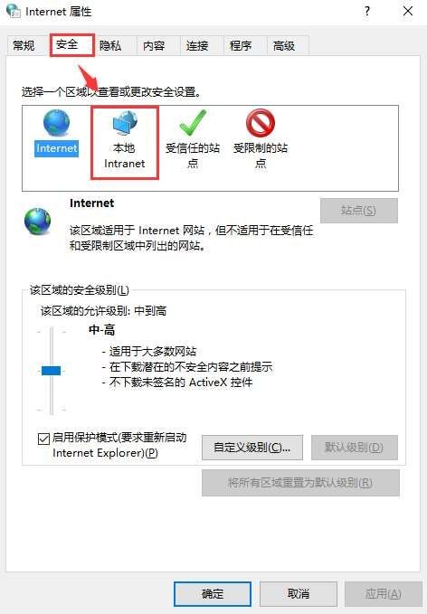 备注名称:只需将当地intranet调至最少等级就可以,不用调整internet那这方面的安全等级。