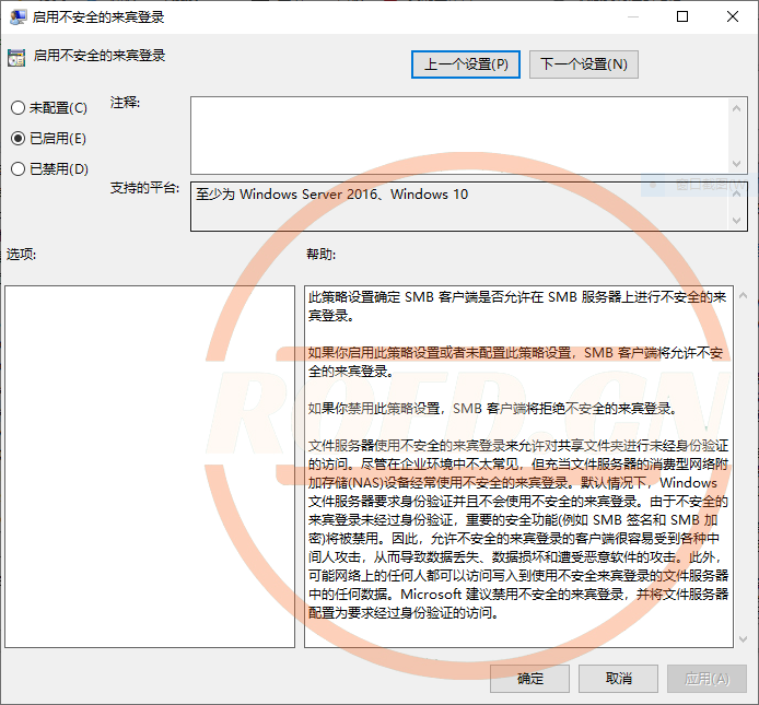 3.双击启用不安全的来宾登录,弹出窗口如下: