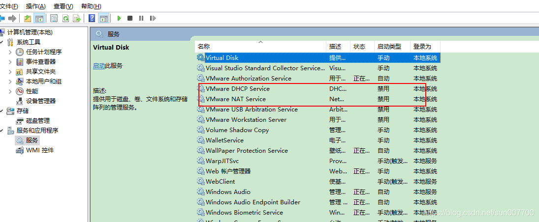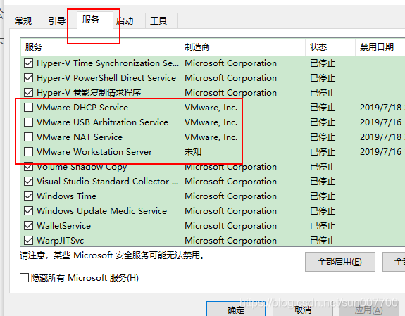 在左下角“开始”菜单,"运行"里输入msconfig,将服务里的VMware相关的禁用。